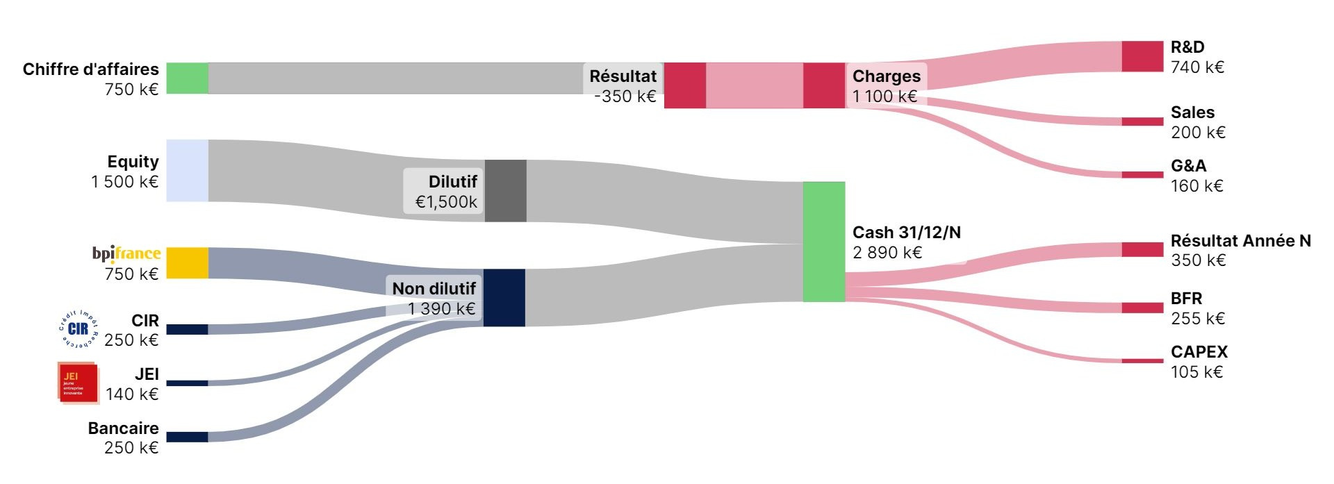 Sharpstone published a Sankey diagram (a type of flow diagram where the width of the arrows is proportional to the represented flow) to represent the circulation of cash within a young startup. It shows that the startup is generating an operating loss, but this is offset by non-operating cash flow from both dilutive and non-dilutive fundraising. This highlights the importance of building a solid financial roadmap to survive the early years.